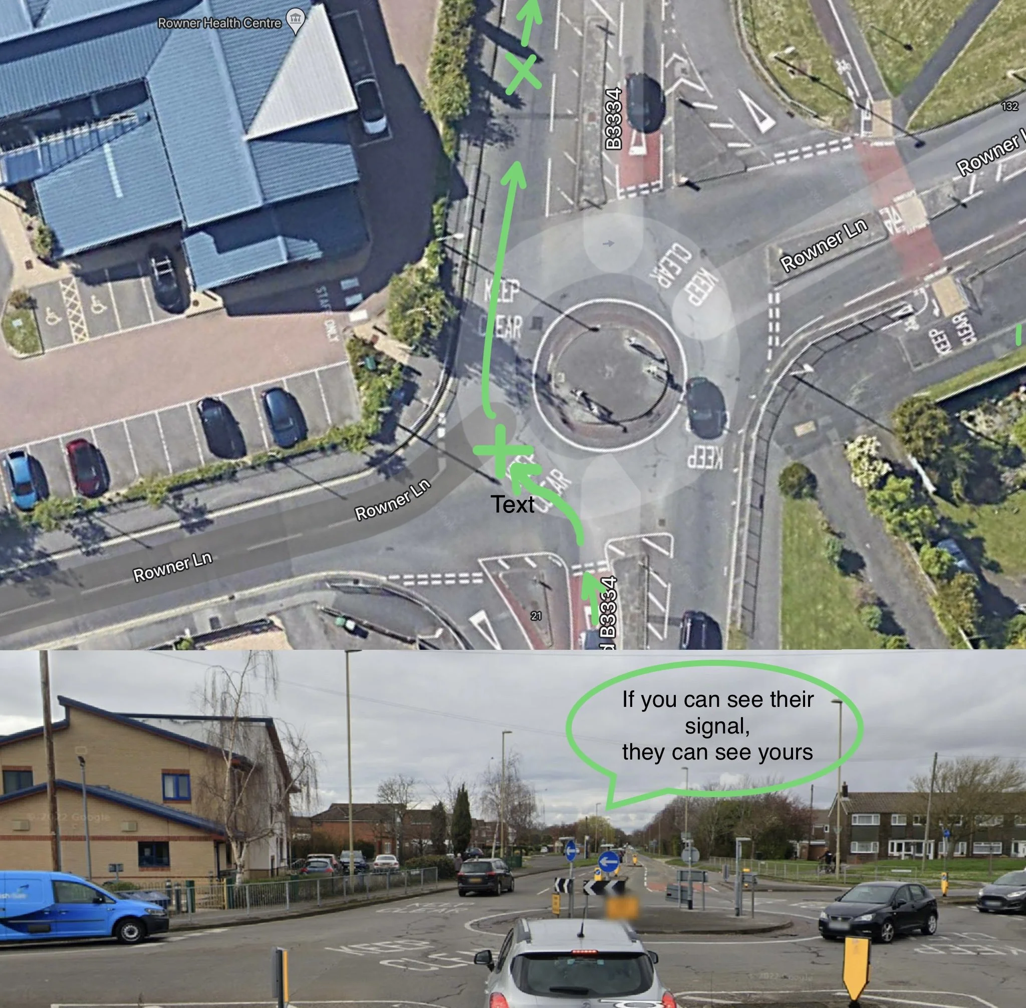 A digital diagram of driving instructions for approaching a roundabout, including signals, gear shifts, and braking, with annotations explaining when to accelerate, brake, and signal lane changes.