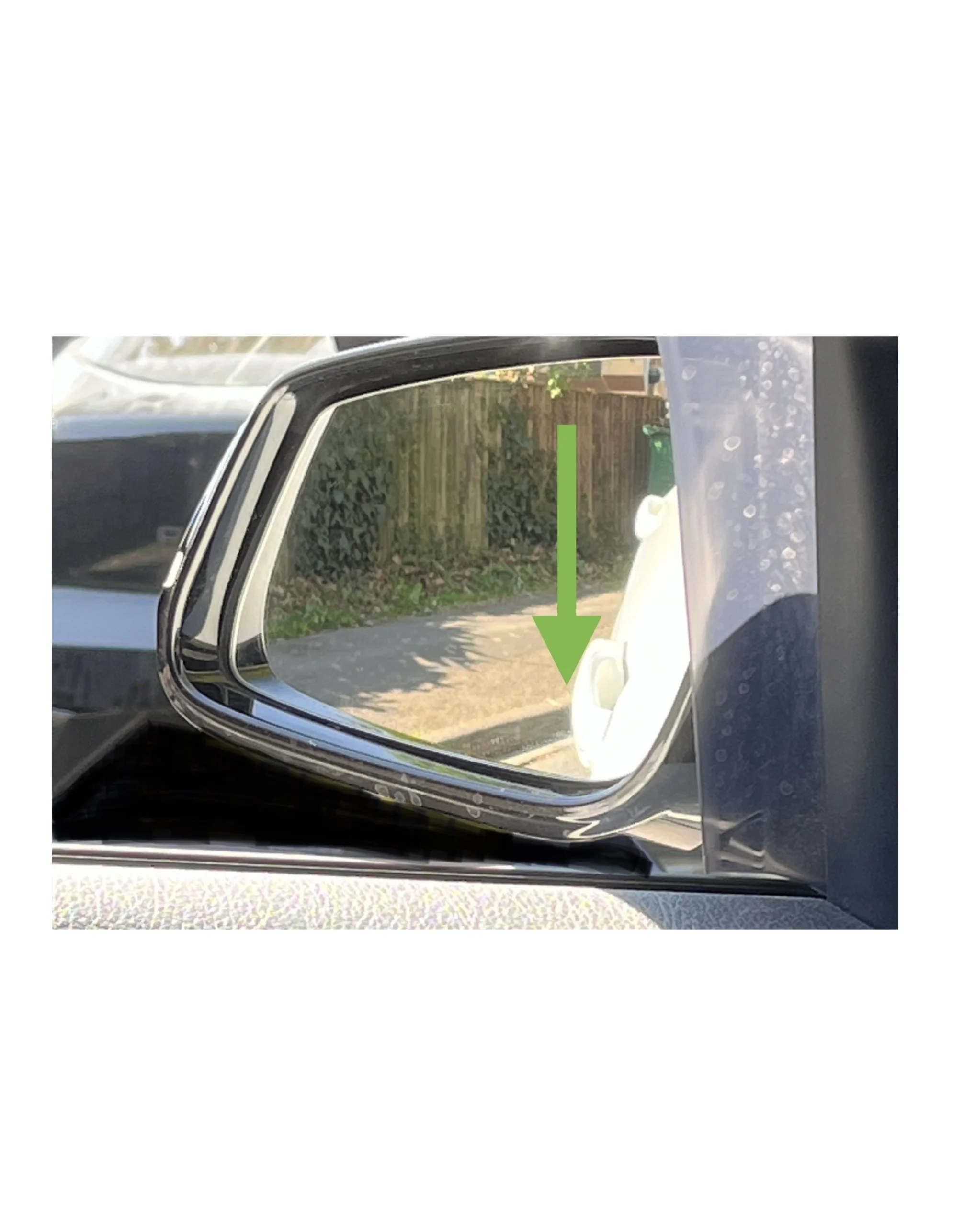 Side-view of a car's side mirror with an green arrow pointing downward
